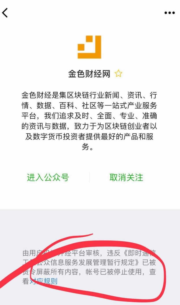 昨晚,一大波区块链行业微信公众号被批量封停了!其中包括金色财经、火币资讯、币世界、深链财经等在内的一系列知名区块链微信公众号!