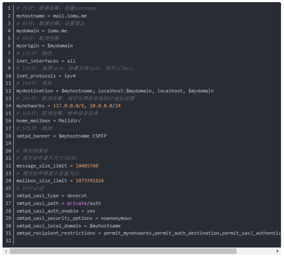 编辑/etc/postfix/main.cf,可以下载下来修改,也可以使用vi进行编辑:
