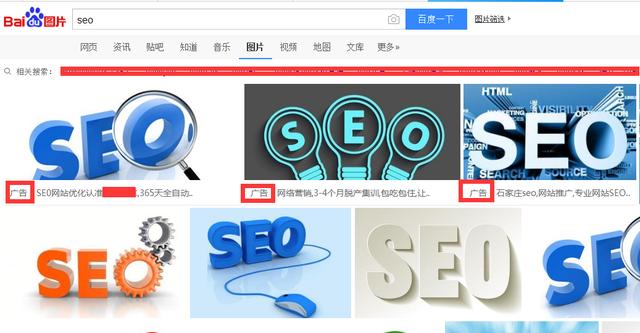 例如,在百度图片搜索“SEO”,出现的前三个为企业在百度图片投放的广告,从左下角能看到“广告”二字。